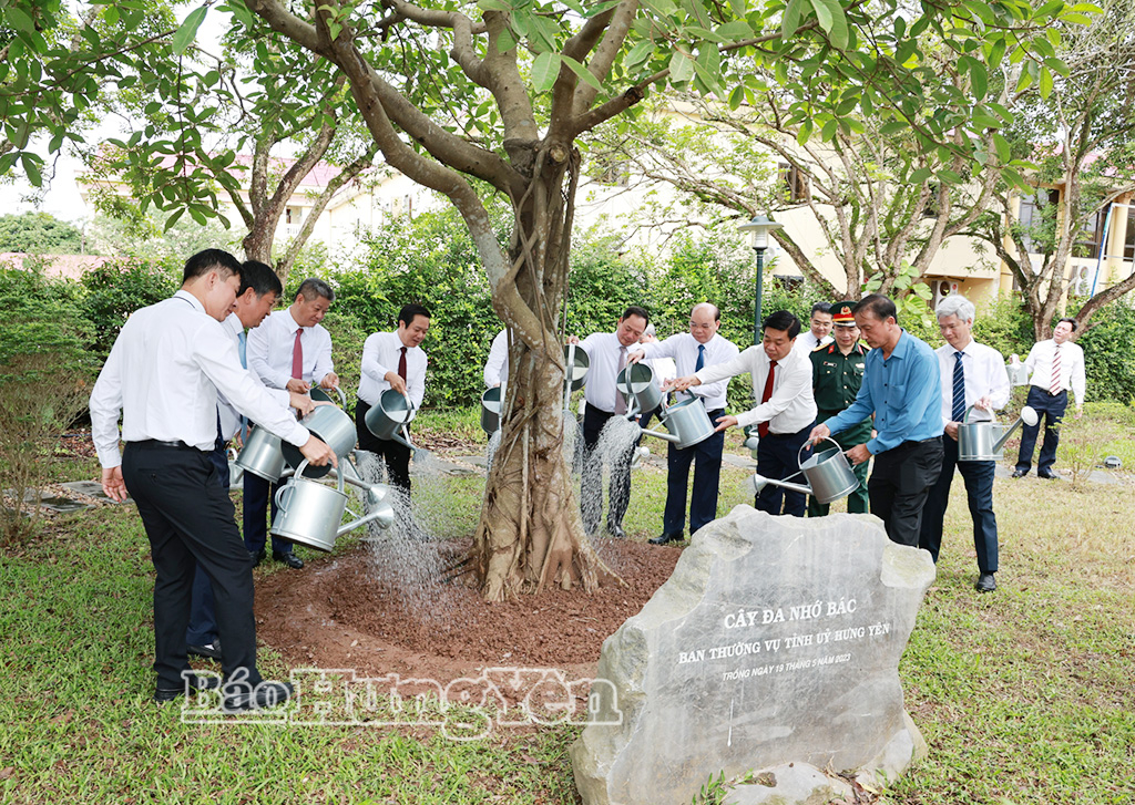 Các đồng chí lãnh đạo tỉnh cùng các đại biểu chăm sóc “Cây đa nhớ Bác” tại Nhà lưu niệm Bác Hồ (phường Phố Hiến).