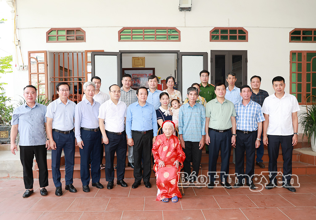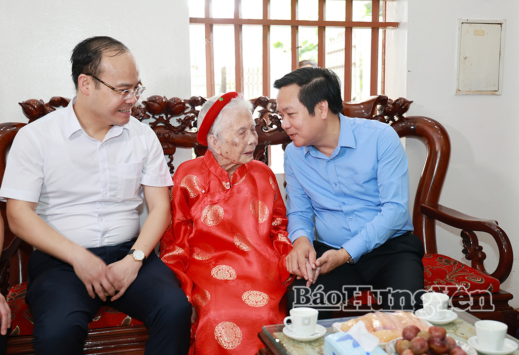 Đồng chí Phạm Quang Ngọc, Ủy viên Ban Chấp hành Trung ương Đảng, Bí thư Tỉnh ủy ân cần thăm hỏi sức khỏe Bà mẹ Việt Nam anh hùng Đỗ Thị Kê.