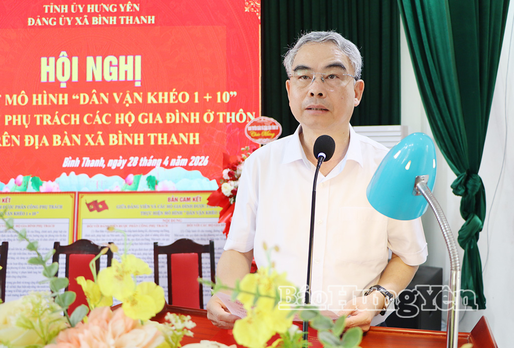 Phát biểu tại hội nghị, đồng chí Phạm Đồng Thụy, Ủy viên Ban Thường vụ Tỉnh ủy, Giám đốc Sở Giáo dục và Đào tạo nhấn mạnh hiệu quả của mô hình phụ thuộc trước hết vào tinh thần trách nhiệm và sự gương mẫu của mỗi cán bộ, đảng viên. Vì vậy, các đảng viên được phân công phải thực sự “gần dân, sát dân, hiểu dân”, trở thành cầu nối tin cậy giữa cấp ủy, chính quyền với Nhân dân; chủ động nắm bắt tâm tư, nguyện vọng chính đáng của người dân để kịp thời phản ánh, đề xuất giải pháp phù hợp. Đồng chí yêu cầu Đảng ủy xã Bình Thanh cần phân công nhiệm vụ rõ ràng, cụ thể, gắn trách nhiệm cá nhân với kết quả thực hiện ở từng thôn, từng hộ dân; lấy hiệu quả công việc làm thước đo quan trọng trong đánh giá, xếp loại đảng viên. Trong quá trình triển khai, cần phát huy cao độ nguyên tắc tập trung dân chủ, tăng cường đoàn kết nội bộ, lan tỏa tinh thần trách nhiệm trong toàn hệ thống chính trị. Các ban, ngành, đoàn thể trong xã phải vào cuộc đồng bộ, chặt chẽ, tạo sức mạnh tổng hợp để mô hình “Dân vận khéo 1+10” được triển khai hiệu quả, thực chất, góp phần nâng cao đời sống Nhân dân và giữ vững ổn định cơ sở.